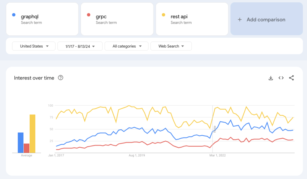 If Google Trends is a decent indicator, GraphQL was on a trajectory to overtake REST API, but it started to plateau around the end of 2019. gRPC, another post-REST API technology, also grew, but never to GraphQL’s peak.