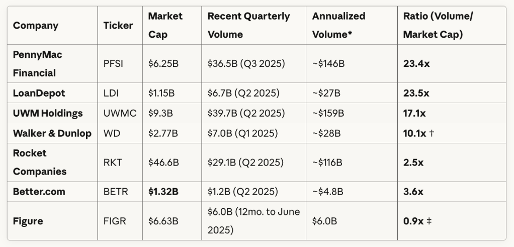 I did also want to share some very rough analysis. I asked Clause to compare loan volume to market cap for a number of publicly traded lenders. I have not double checked these numbers.